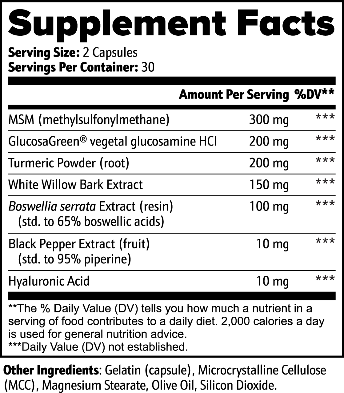Ingredients: MSM (methylsulfonylmethane), GlucosaGreen® vegetable glucosamine HCl, Turmeric Powder (root), White Willow Bark Extract, Boswellia serrata Extract (resin)(std. to 65% boswellic acids), Black Pepper Extract (fruit) (std. to 95% piperine), Hyaluronic Acid, Gelatin (capsule), Microcrystalline Cellulose (MCC), Magnesium Stearate, Olive Oil, Silicon Dioxide.